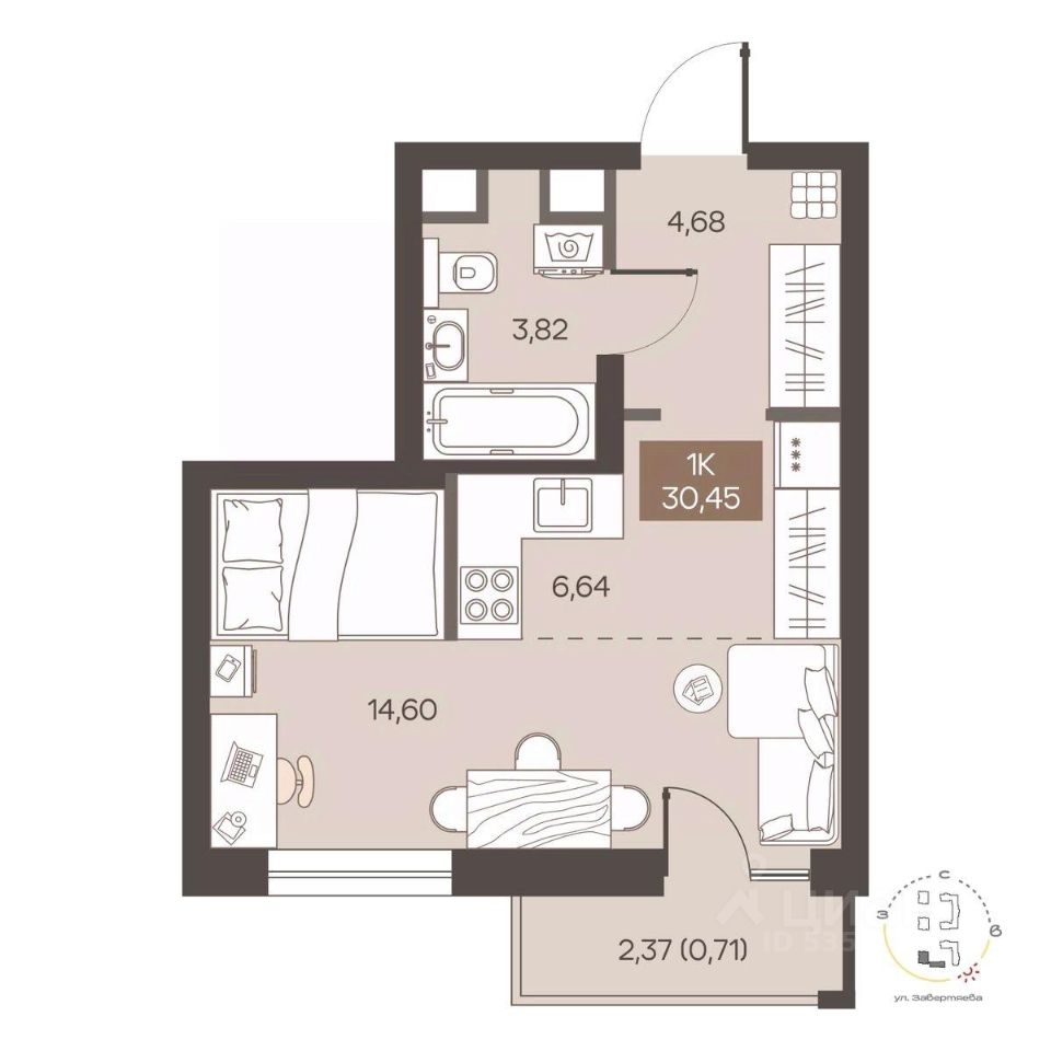 Продаётся 1-комнатная квартира в строящемся доме (Дом 1.1), срок сдачи: II-кв. 2027, общей площадью 30.45 кв.м., на 4 этаже. Новый жилой комплекс "Заря на Завертяева" от Специализированного застройщика "БРИК" расположен по адресу: г. Омск, ул. Завертяева.