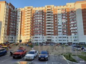 Рядом с домом большая парковка, огорожена шлагбаумом.
