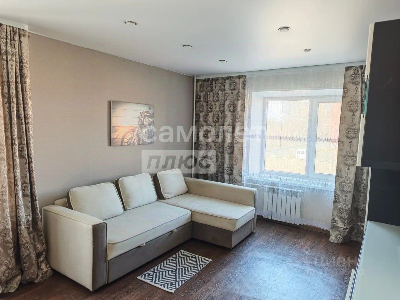 Окна квартиры выходят на солнечную сторону, наполняя пространство естественным светом и создавая теплую, приятную атмосферу.