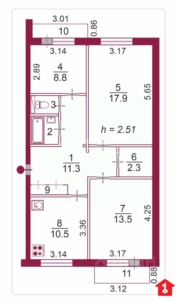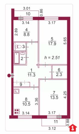 Квартира обладает отличной планировкой: жилая площадь составляет 40,2 кв. м, площадь кухни — 10,5 кв. м. Площадь комнат — 8,8 + 17,9 + 13,5 кв.м.