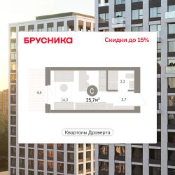 Продается 1-комн. студия с предчистовой отделкой в Кварталы Драверта на 7 этаже. Общая площадь: 25.72 кв.м., площадь гостиной 14.3 кв.м., из которых 5 кв.м. выделено под кухонную зону. Все окна выходят на одну сторону. В квартире один балкон, один совмещенный санузел. Высота потолков 2.8 м.