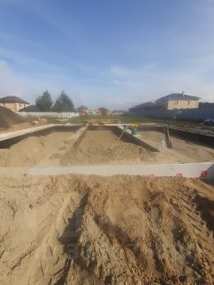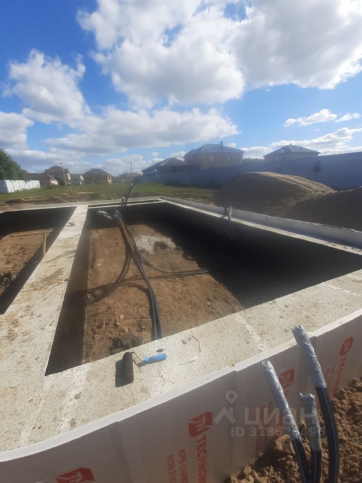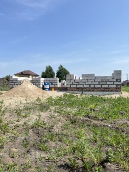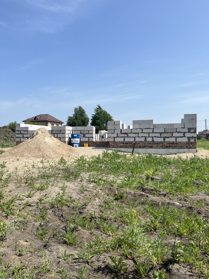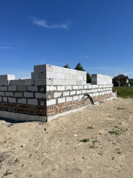 Участок 10 соток, правильная прямоугольная форма, в собственности. Улица Тихая. Кадастровый номер 1259. Готов фундамент с наружными размерами 12*11 метров, шириной 0.5 м и глубиной 1 метр с двумя перемычками внутри. Залит единым целым с крыльцом и террасой. Утепление наружной части "пеноплекс" 50мм. Выполнена обратная засыпка песком (плодородный слой снимали до глины) с послойной трамбовкой и проливкой. Снаружи пазухи утрамбованы супесью шириной 1 метр. Выложено 5 рядов "забутовочного" кирпича, далее 6 рядов из газобетонного блока "Сибит" плотность Д500 ширина 400. Завезен брус 150*50 в количестве 6 м3 для кровли.