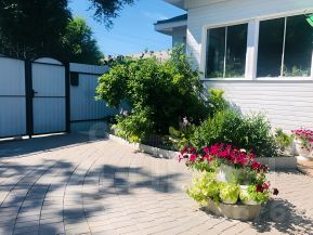 Во дворе — уложена брусчатка с многолетними цветниками. Очень много.