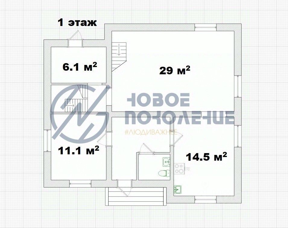 На первом этаже — просторная гостиная с большими окнами, наполненная светом, уютная кухня-столовая, гостевая комната и санузел.