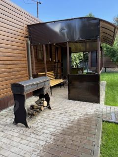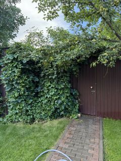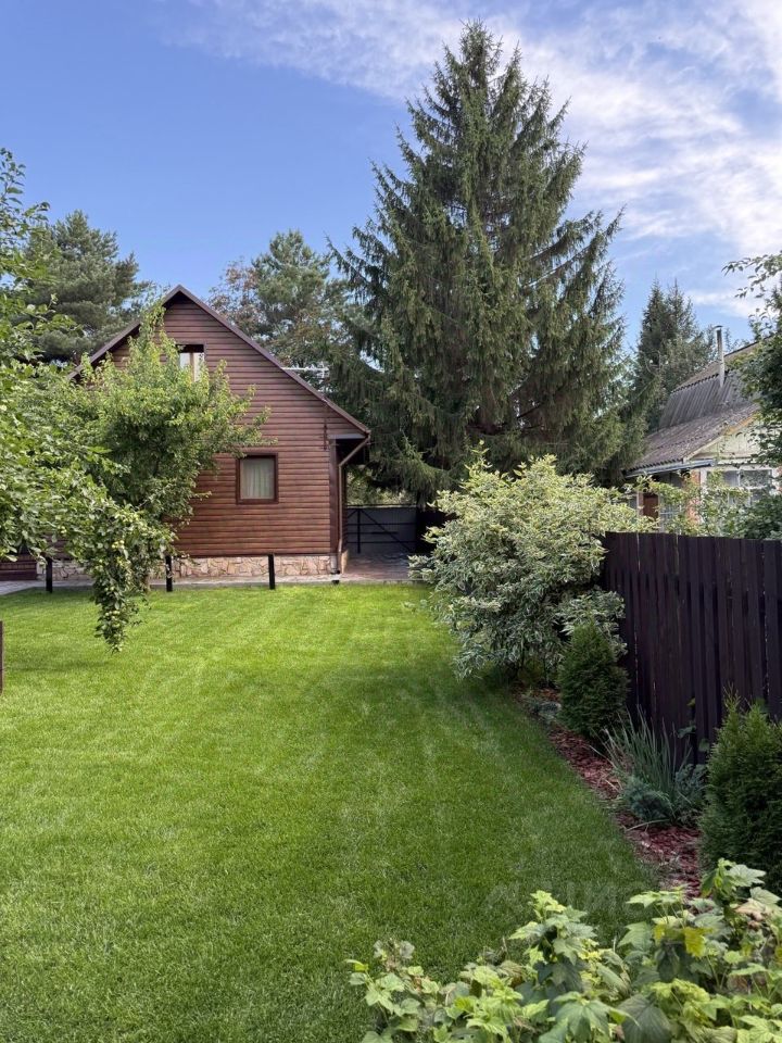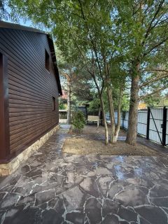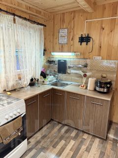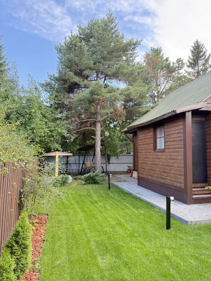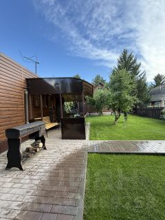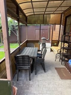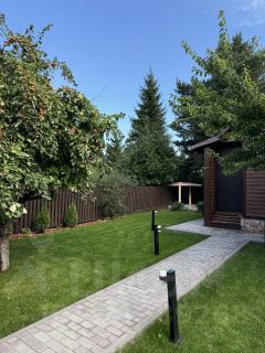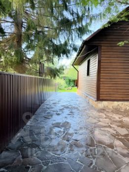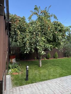 На ухоженном, сухом и аккуратном участке 5 соток расположен дом из бруса, баня с летней кухней, туалет, беседка с мангалом. Высажен газон, туи, 2 яблони. Территория ограждена забором. Зона въезда во двор залита бетоном и выложена рваным камнем, дорожки - тротуарной плиткой, оснащены освещением.