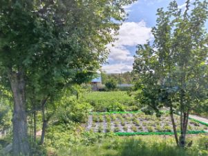 Посажены яблони, смородина, малина, клубника, слива, молодые ели.