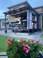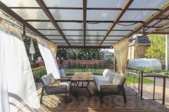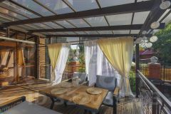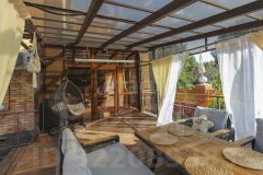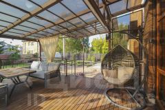 Летняя терраса с выходом из кухни заслуживает отдельного внимания. Она расположена на уровне первого этажа, с обратной стороны дома с видом на зеленую территорию. Это потрясающе уютное пространство оборудовано мягкой зоной отдыха, создано для теплых летних вечеров в кругу родных и друзей и атмосферных завтраков на свежем воздухе.