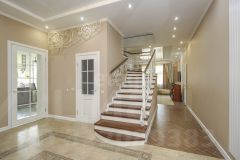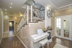 На второй этаж ведет лестница, выполненная из бука. Лестница расположена в середине дома, что придает внутреннему интерьеру отдельный шарм и уникальность.