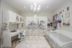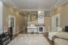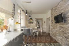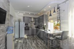 - Просторная кухня, в актуальной цветовой гамме, условно разделенная барной стойкой на зону приготовления и обеденную. Здесь продуман каждый сантиметр: встроенная техника, электрическая плита, духовой шкаф. Кухня имеет выход на зимнюю и летнюю террасу.