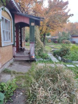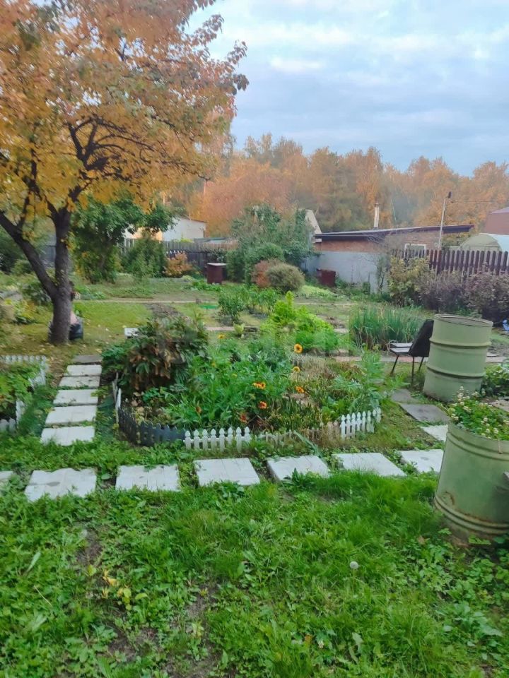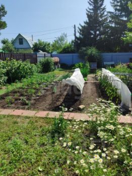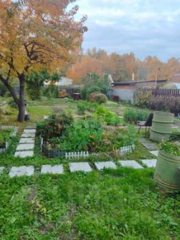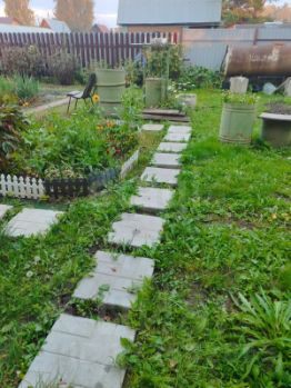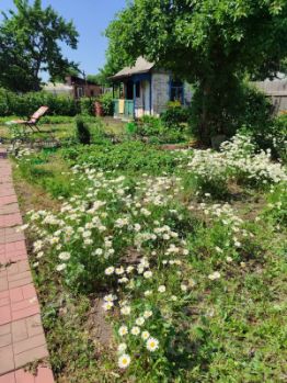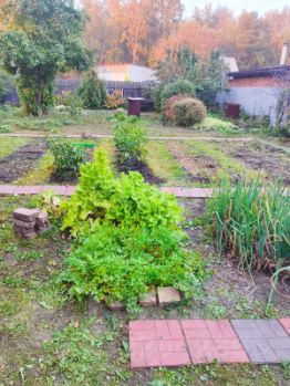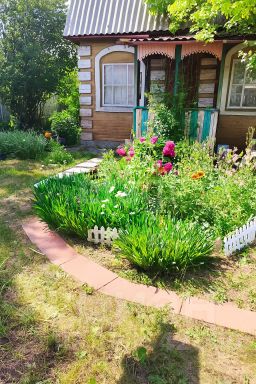 Имеются многолетние цветы (розы, лилии, пионы) и насаждения (вишня, черная смородина, малина, груша, яблони, калина, крыжовник, черная рябина).