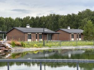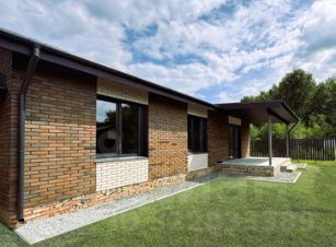 - Стены общей толщиной более 400 мм (газобетон 200 мм, минеральная вата 100 мм, ветрозащитная плёнка, облицовочный кирпич);