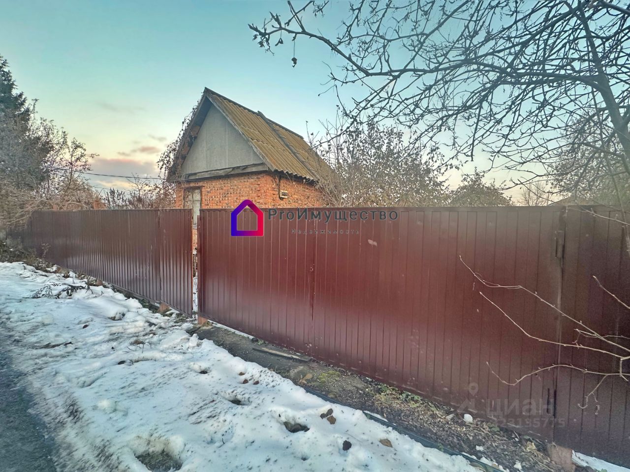 Небольшой кирпичный домик, бытовка, колодец, забор из проф листа, ворота, заезд под автомобиль.