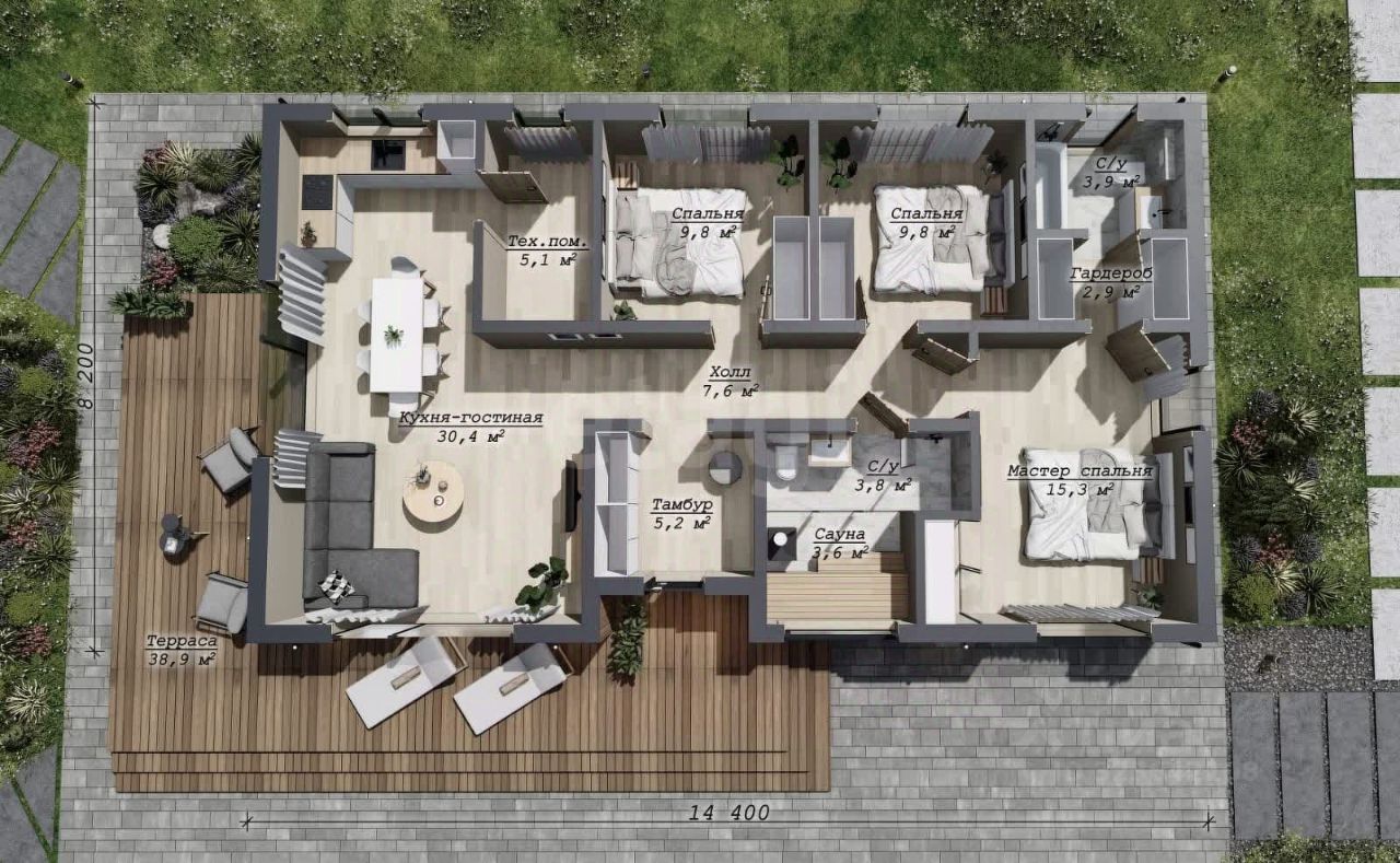 Дом общей площадью 146 м², включая просторную террасу и крыльцо 39 м², предлагает рациональную планировку с жилой зоной 107 м². Ключевые преимущества — изолированная мастер-спальня с собственной гардеробной и санузлом, а также интегрированная сауна для полноценного отдыха. Панорамное остекление наполняет интерьер естественным светом и визуально объединяет пространство с окружающей средой. Объект возведен по каркасной скандинавской технологии с усиленным утеплением стен (200 мм) и кровли (250 мм), что в сочетании с системой водяного теплого пола обеспечивает минимальные расходы на отопление. Фундамент — железобетонный ленточный, кровля выполнена из гибкой черепицы Docke, установлены пластиковые окна с двухкамерными стеклопакетами. Комплектация включает завершенную наружную отделку, разводку инженерных систем к точкам потребления и паркинг на два автомобиля. Участок площадью 8 соток в составе клубного поселка обеспечен электричеством 15 кВт, колодцем с системой подачи воды и локальной канализацией; запланировано подключение газа осенью 2025 года. Поселок расположен на самой высокой точке Омска (128 метров над уровнем моря), что исключает подтопление, и характеризуется закрытой территорией с 33 участками, продуманной планировкой без эффекта "окно в окно" и примыканием к лесному массиву. Все дома выполнены в едином современном стиле с соблюдением норм инсоляции и расстояний, предоставляя возможность размещения дополнительных построек. - Подходит под все программы льготной ипотеки (Семейная, Сельская, IT и др.)