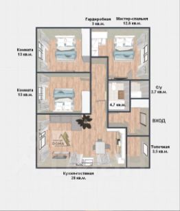 Планировка: 2 изолированные комнаты, мастер-спальня с санузлом и гардеробной санузел, топочная, практичная входная зона, просторная кухня-гостиная с французским окном.
