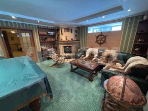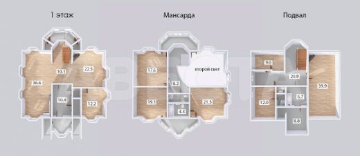 В доме на втором этаже расположены три спальни с выходами на лоджии, общий санузел с душевой, кроме того, в одной из спален оборудован отдельный санузел с ванной. На первом этаже находятся прихожая, вместительный гардероб, санузел, просторная кухня-столовая, гостиная в два света с камином, кабинет. На нулевом этаже — бильярдная комната, постирочная комната, кладовая, мини зал для тренировок с санузлом и душевой, котельная.