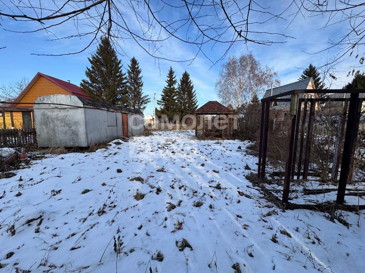 На территории участка установлен летний туалет, деревянная беседка и вагончик с просторными комнатами для летнего проживания.