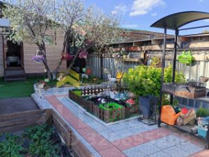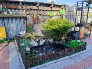 Придомовая территория очень ухожена: зона барбекю, пруд с фонтаном, газон, множество цветов и различных деревьев, везде уложена тратуарная плитка, по всему периметру освещение, в вечернее время создаётся очень благоприятная отмосфера.