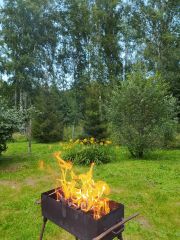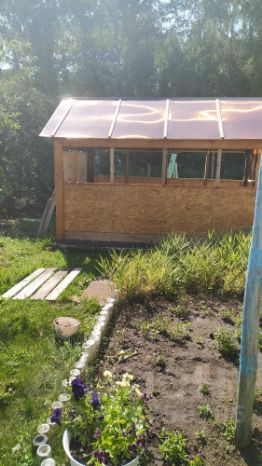 На усадьбе высажены 5 огромных яблонь, две ели. Площадь огорода занимает 12 соток. Построена беседка для отдыха. Имеются гараж 6 х 4, хорошая баня 3,50 х 4,50, хозяйственные постройки для скотины 4 х 8 для содержания крупнорогатого скота и лошади , амбар и сарай из кирпича, навесы. В доме две комнаты и просторный зал, кухня, два коридора, туалет, отдельное помещение для котла.