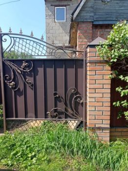 Огорожен профнастилом. Кованые ворота.