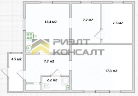 Планировка дома включает три комнаты: гостиную 17 кв.м, две спальни по 7,2 и 7,3 кв.м, просторную кухню 12,3 кв.м, совмещенный санузел с ванной.