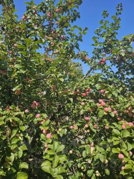 * Плодоносящий сад: яблони с богатым урожаем, облепиха