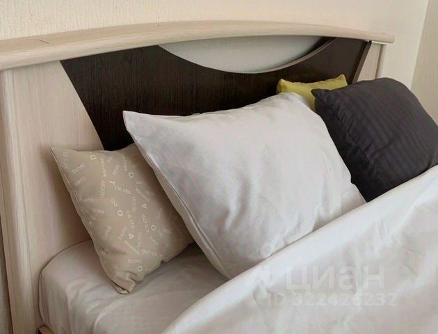 большая двуспальная кровать с пружинным мaтраcом и пушистыми подушками.